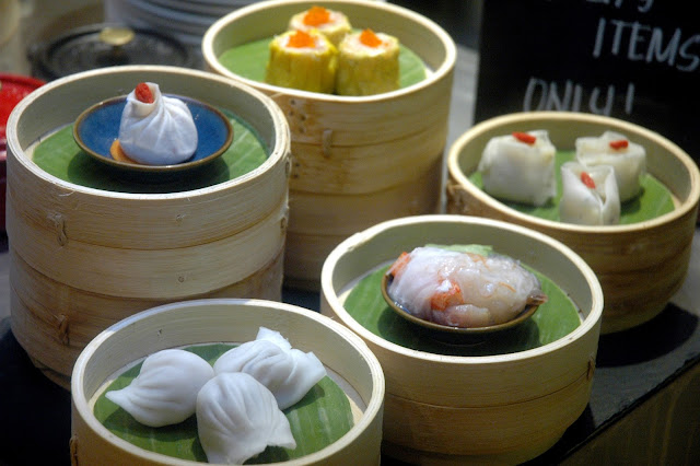 At the Dim Sum Station, you'll find Prawn Hakao, Scallop Dumpling, Seafood Roll, Xiao Lum Bao, and Pork & Shrimp Siomai, small bites with big flavors.