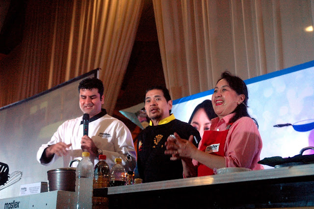 Masflex's Hiren Mirchandani (L) and Nancy Reyes Lumen (R) is joined by Masflex Brand Ambassador Gene Gonzalez (center) in presenting the latest product innovations with their line of new digital scales. Then, it was time for the "Adobo Queen" to spin her own magic using Masflex for her homespun and rustic family recipes...