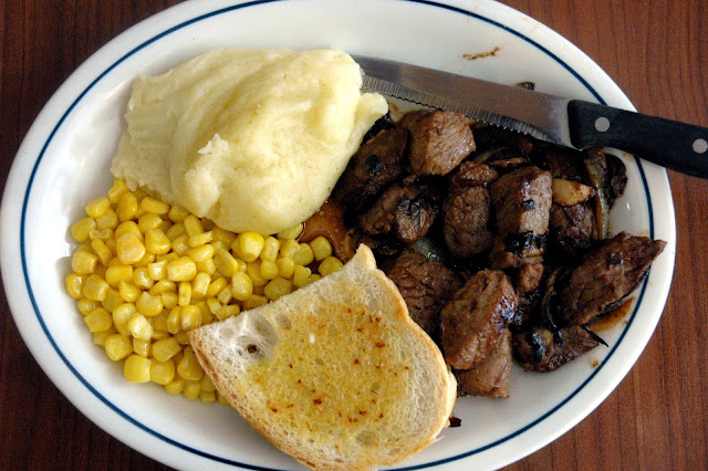After IHOP's Original Buttermilk Pancakes, it's time for a late afternoon Sirloin Steak Tips Dinner (P 695), tender sirloin tips with grilled onions and mushrooms, served with mashed potatoes and buttered corn.