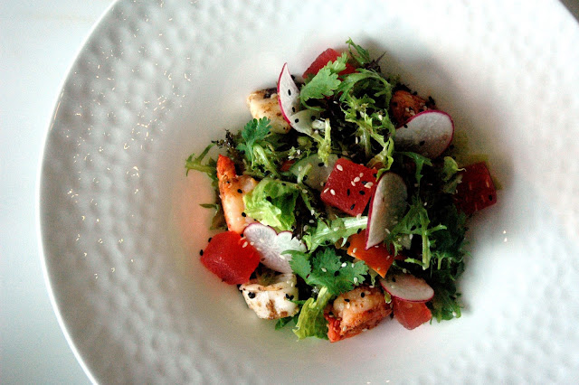 "People can expect each dish to be perfectly well-balanced and with no-frills. Here, we promise exquisite dining with a more casual edge," explained David Pardo de Ayala. And that's exactly what you can expect at Flame Restaurant, with its modern take on classic European cuisine with an Asian spin. The mid-day light casts its own unique glow to Flame Restaurant's modern and contemporary interiors, perfectly illuminating the new lunch menu. The very name of the restaurant reflects the intense passion for culinary innovation, and this is seen, tasted, and experienced in each new dish served during the lunch preview. The refreshing Chilled Seafood Salad, with baby squid, octopus, shrimp, and compressed watermelon drizzled with ginger-sesame dressing, combines the clean notes of garden fresh greens with the briny flavors of seafood, capped by the sweetness of the watermelon and sharp Asian-style dressing. It's the perfect starter to any meal at Flame Restaurant, as the next round of dishes were served...