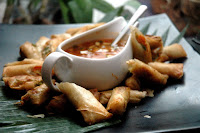 The equally refreshing Cucumber Salad (L) with tomatoes, onions, and egg delivers fresh and clean notes, punctuated by the sharp vinaigrette, and the crisp Lumpiang Gulay (R) offers tasty little bites before the next round of main courses at Cafe Belmont's Southeast Asian Night.