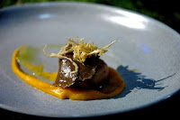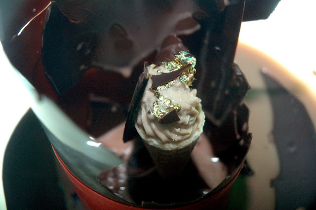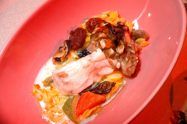 ...Monk Fish Fillet in Cara Fata, Octopus, Chorizo, and Saffron Orzo with Pernod-Infused White Wine Sauce, a rustic yet elegant Mediterranean-inspired dish paired with a glass of wine from Bodega O. Fournier Urban Oco. Cooked in a bag, the servers then cut open the bag releasing a fresh and intense aroma. The gentle notes of the monk fish are punctuated by the upfront flavors of the chorizo, rounded out by the soft saffron orzo and creamy white wine sauce for yet another expertly composed dish. One more glass of wine, and it was time for the evening's fourth act.
