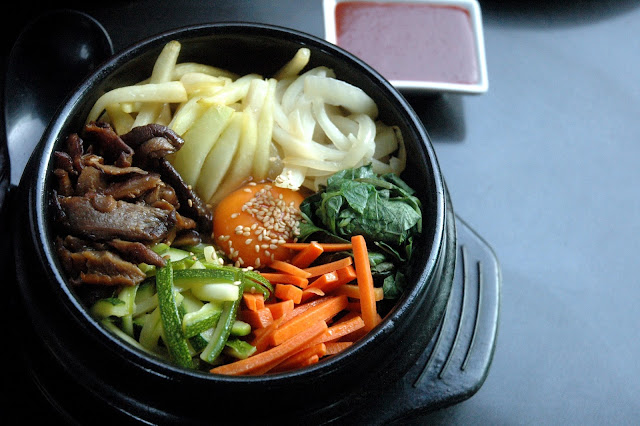 And here's the beef. The Stoned Grill Ribeye Kagoshima (Kagoshima & Saga-P 1,300 per 100g/Ohmi-P 1,540 per 100g/Hida-P 1,640 per 100g), tender and perfectly marbled slabs of A5 Kagoshima Wagyu flown fresh from Japan, delicately seared on a hot stone grill served with onions, carrots, French beans, and a side of ponzu sauce, homemade sesame dressing, and the special Buta + Wagyu spice...pure Wagyu heaven.