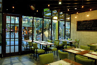 Mesclun Bistro offers two convenient seating options, including an al fresco dining area. The French doors and glass windows allow sufficient ambient light to filter in, and at night, Mesclun's lighting is adjusted for a warm glow, giving the cool modern lines a rustic feel and vibe.