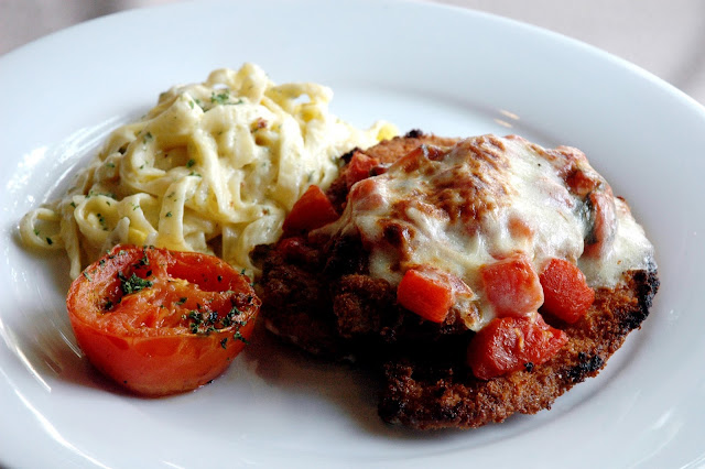 ...the Chicken Parmesan (P 310), breaded chicken breast topped with a creamy cheese sauce and tomatoes and served with fettuccine al burro...