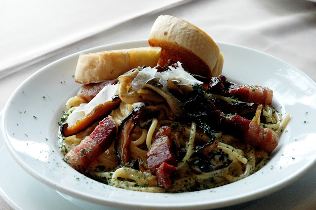 ...followed by the Three Mushroom Pasta in Black Truffle Oil with Bacon, with shiitake, button and oyster mushrooms topped with thick-cut bacon, seriously thick-cut bacon, and seriously good.