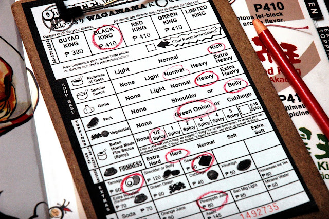 For me, it's the Black King or Kuroo (P 410), prepared just the way I like it with Ramen Nagi's innovative Omotenashi Sheet where customers can customize their ramen to fit individual preferences. My Black King is customized with an extra richness and a heavy dose of garlic with the regular level of special sauce for intense nutty notes, with fork-tender pork belly and green onions for balanced flavors. With the Black King's bold flavors, you don't need to boost the level of spicy heat. Tamago and seaweed completes my customized bowl of ramen, with firm yet chewy noodles for a perfect finish. You may also opt for the Chef Recommendation by marking the appropriate box.