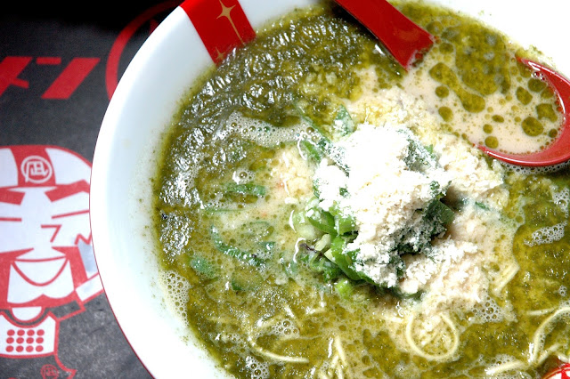 ...like the Green King or Midorio (P 410), an innovative fusion of fresh basil and olive oil with the rich and savory signature tonkotsu broth garnished with grated Parmesan cheese and tender perfectly marbled pork chasiu...