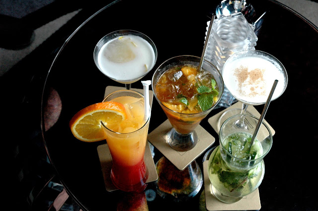 Complete the vibe with a round of Bar 27's inventive signature cocktails (P 420 net), including (clockwise from top left) the wittingly named Whiskey Business, a smooth blend of bourbon, lemon juice, sugar syrup, and egg white; the Read Between the Gin, a soothing cocktail with Pimms #1, lemon, lime, mint, cucumber, orange and clear soda; the Friendly Fire, a light and easy cocktail with gin, Triple Sec, and Lime Juice; the Cool As A Cucumber, a minty cocktail with rum, lime juice, simple syrup, and mint leaves; and the colorful Manila Bay Sunrise, with tequila, orange juice, and Grenadine syrup. Bar 27 offers, you guessed it, twenty-sevensignature cocktails with playful names like Never Mind...Her, Fly Me To The Malt, Sexy In The City, No Gin, No Glory, Casual Ex, Shot Gun Wedding, and Go Drunk, You're Home. Bar 27 categorizes all their cocktails under distinct headings like Chill, Upbeat, and Party, so depending on your mood, Bar 27's got the right cocktail for you. It's also a good reason to plan a second and a third or more return trips to Bar 27 to try all twenty-seven cocktails. Now that sounds like a plan, twenty-seven cocktails at Bar 27 in one night...