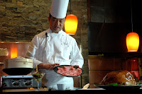 Known for their signature steaks, The Fireplace was the perfect venue for the Saga Beef preview (for more on Fireplace, see my earlier post, What's New at The Fireplace). Inside The Fireplace, the prized beef was presented by guest Chef Shimoyama as he detailed the signature characteristics of the premium beef. Japanese Wagyu beef's unique genetic predisposition and special diet yields a highly marbled red meat for enhanced flavor, tenderness and juiciness, with Saga Beef ranked at Grade 4 on the Beef Standard, and rated 7 on the Beef Marbling Standard by the Japanese Meat Ranking Society. The fine-grained marbling, the signature trademark of Saga Beef also known as "tsuya-sashi"or glossy marbling, is what diners can expect from every cut of Saga Beef.