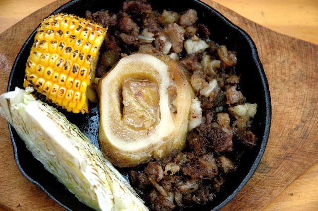 The soft and crunchy pork mask add texture to the dish, capped by the savory gravy. But it's the bone marrow that absolutely takes this dish over the top, with its buttery richness capping an indulgent sisig makeover. The torched corn and cabbage completes the dish with its fresh and subtle sweet notes to balance the dish. And Chef Ed Buguia has more sisig creations to whet your appetite. Sisig with cheese and chicken skin? Absolutely. At Blaze Flaming Sizzlers, you'll find other savory and sizzling options including their Sizzling Steak and Rice, Sizzling Burger Steak with Cheese Core and Corn Mash, Fried Chicken with Cheese and Corn Mash, and Sizzling Lengua with Gravy.