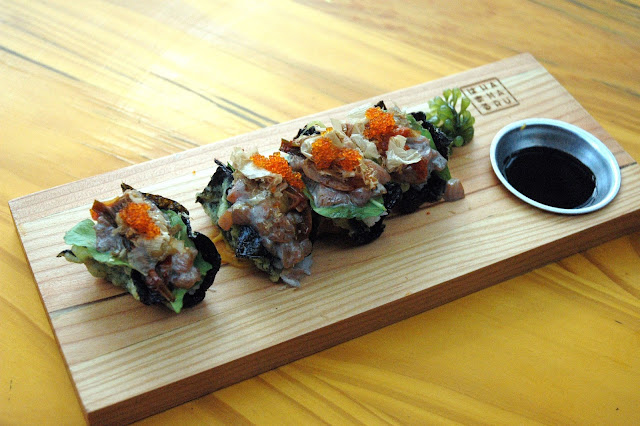 ...and the signature Hamaru Soft-Shell Crab Roll (P 430) with deep-fried soft shell crab wrapped in a rice roll topped with crab meat and creamy aligue or crab fat mayo.