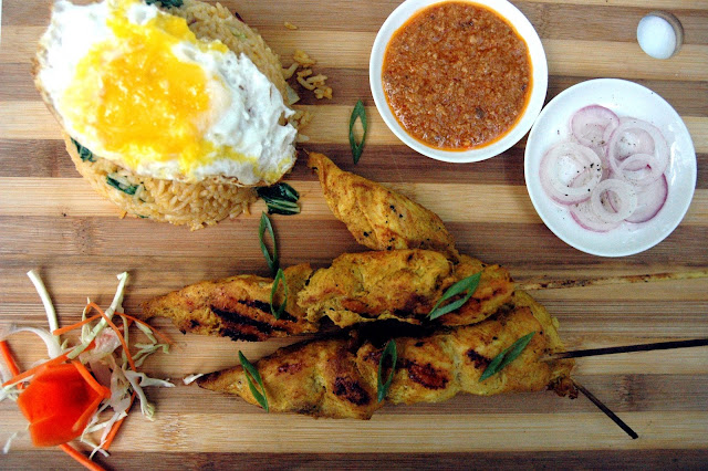Indonesian Nasi Goreng with Chicken Satay (P 390) with three skewers of richly marinated chicken served with red onions, chili peanut sauce, and nasi goreng topped with egg, is a meal in itself.