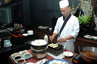 The comforting Kaninabe, a refreshing assortment of seafood and vegetables boiled in a special paper fan,is another unexpected surprise, a visual feast that tastes as good as it looks. A gentle flame below the paper fan keeps the soup warm. The use of the paper fan adds to the presentation of the dish. Simple, fresh and clean flavors, the freshness of the seafood is complemented by the light broth.