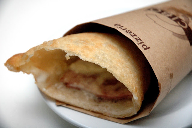...like the Pizza Fritta (P 249), a Neapolitan-style fried pizza dough pockets with two tasty filling options: Tomato, Mozzarella, and Basil; and Smoked Ham, Bel Paese, Mozzarella and Fontina draped in Groviera Cream. One bite and the light crispness of the fried pizza crust's outer layer delivers a subtle yet audible crunch contrasting with the soft and delectably chewy texture of the inner crust. The Smoked Ham option offers rich and savory notes, while the Tomato, Mozzarella, and Basil has fresh, clean and tart flavors. Wrapped in paper, it's a handy meal that you can take with you anywhere.