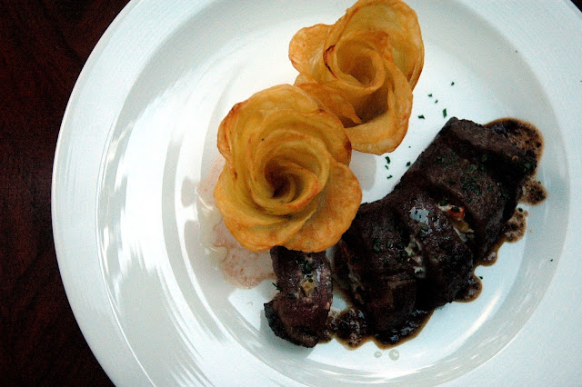The savory Roasted Lamb Loin Stuffed with Goat Cheese, Ratatouille, Potato Rosette, and Black Olive Jus features fork-tender lamb with the richness of goat cheese for even more intense flavors with every bite...