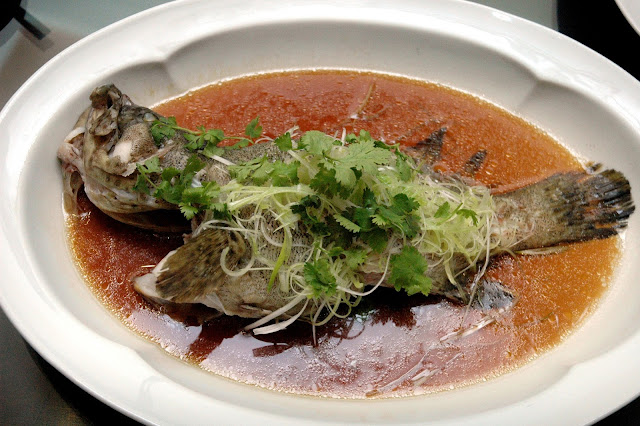 ...starting with the Pink Garoupa Steamed with Soya Sauce (based on prevailing market price), a delicately steamed whole fish topped with fresh scallions...