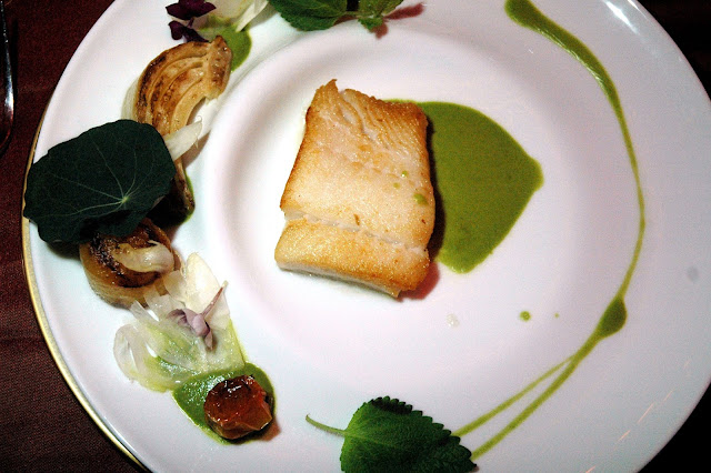 ...and lavish flavors. The first course for the evening's dinner featured Shangri-La's Sea & Garden, an intricately plated course with Fillet of Halibut, herb beurre blanc, fennel and leaves served with a glass of Oakridge Over The Shoulder Chardonnay. The tender and flaky halibut just melts in your mouth releasing its briny sweetness capped by the smoky notes of delicately roasted vegetables and the rich herb-infused beurre blanc.
