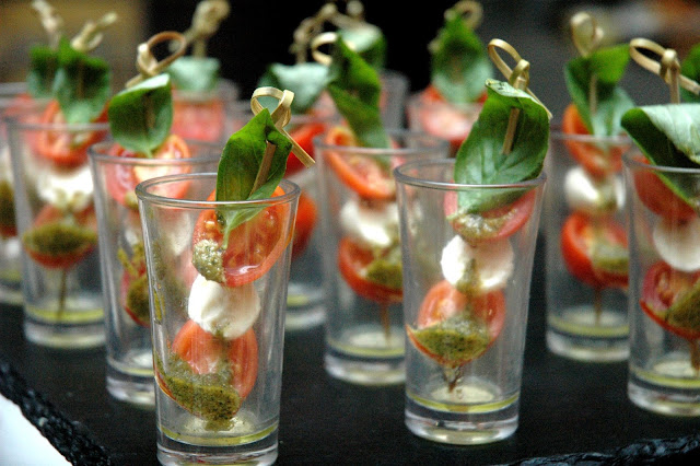 Start with some tasty appetizers with shots of Caprese in Skewers, with fresh cherry tomatoes and burrata drizzled with pesto...