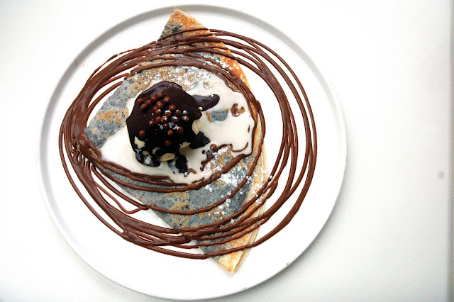 But my absolute dessert favorite at Bizu Creperie is the Grand Chocolat (P 315), with a soft crepe coated with chocolate and folded, topped with chocolate covered vanilla ice cream sprinkled with Valrhona chocolate pearls and drizzled with indulgent chocolate syrup. The deep, nutty and intense flavors of the premium chocolate come through, and you want more. The chocolate coated vanilla ice cream, chocolate syrup and chocolate pearls come into play adding layers of decadent chocolate richness. And it just can't get better than that. Sweet or savory? Have both...at Bizu Creperie.