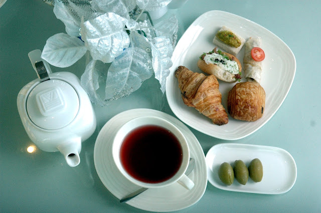 A plate of freshly baked Croissant and Chocolate Croissant, along with the Premier Lounge's Corned Beef Sandwich, Beef Sisig Mini-Pita topped with a slice of cherry tomato and Curry Egg Sandwich offers both sweet and savory flavors in one plate, and you can come back for more...