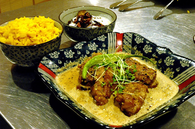 Sri Lankan Black Curry Chicken (P 550), crisp fried chicken cutlets covered in a rich roasted curry sauce paired with cardamom scented basmati rice and a side of fried eggplant raita. The spicy curry sauce has a cooling heat that gradually builds, pairing well with the crisp chicken and the basmati rice.