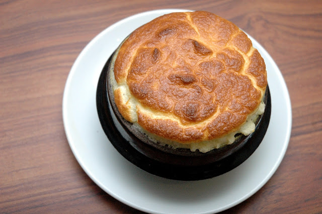 Simply dip your spoon into the soft souffle and you'll have the vibrant orange colored pumpkin soup coating your spoon. The infusion of mushrooms in the thick and hearty soup makes this dish different, as well as the souffle for a blend of comforting flavors.