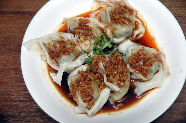 After quick work on a pair of pork dumplings, you don't even think twice about grabbing the last piece, just go for it. The savory richness of the pork is tempered by the soothing heat and mildly sour hints of the hot chili vinaigrette.