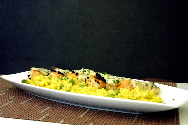 Baked Salmon with a Mediterranean crust on a bed of richly flavored saffron risotto, a light yet filling meal that's great with a glass of crisp white.