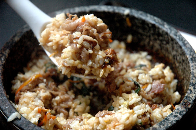 Gently mix it up and enjoy spoonful after spoonful of flavorful rice with beef and egg with the hot stone bowl keeping it warm. Dig deeper and you'll find a tasty layer of lightly crisp charred crust for added texture and flavor. Just like that layer on the bottom of the paellera that everyone loves to scrape.