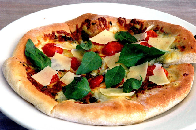 The Caprese, with basil cashew pesto, cherry tomatoes, fresh mozzarella, fresh basil, and Grana Padano Parmesan, served with extra virgin olive oil. Rustic and traditional, the Caprese looks deceptively simple, but one bite releases a burst of flavors that's rich and flavorful. Again, premium ingredients can transform any dish, no matter how simple, and this is evident in CPK's creative pizzas.