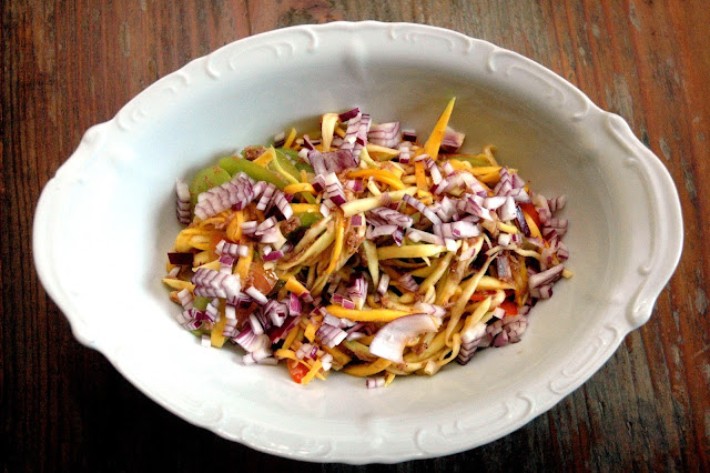 Start with the mildly sweet, tart and sour Ensalada with mangoes and red onions to open up your palate...