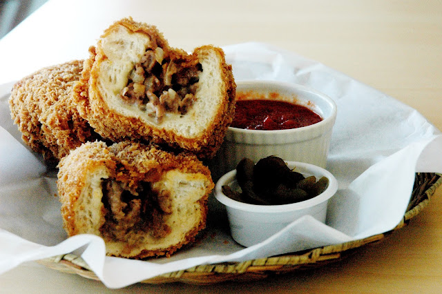 Then, the first of The Cheese Steak Shop's new dishes arrived. The Fried Cheese Steak with Pizza Sauce (7" P 320/10" P 520/15" P 850), the original cheesesteak, deep-fried. Coated in batter and bread crumbs, the whole roll is then submerged and deep-fried until golden brown. Surprisingly, the roll isn't too oily, with each bite delivering a delicious crunch. The melted cheese, onions and grilled steak contrasts with the crisp outer layer, definitely a unique twist on the Philly Cheesesteak. Pour some rich pizza sauce, add some sweet and hot peppers for a burst of flavors. Seriously good.