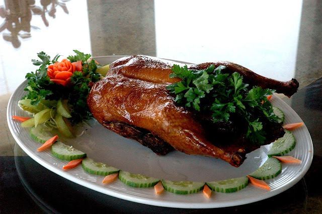 The staff then prepares thin pancakes filled with the crisp duck skin and meat, along with spring onions, thinly sliced cucumber and a sweet bean sauce. The duck is then prepared for yet another dish.