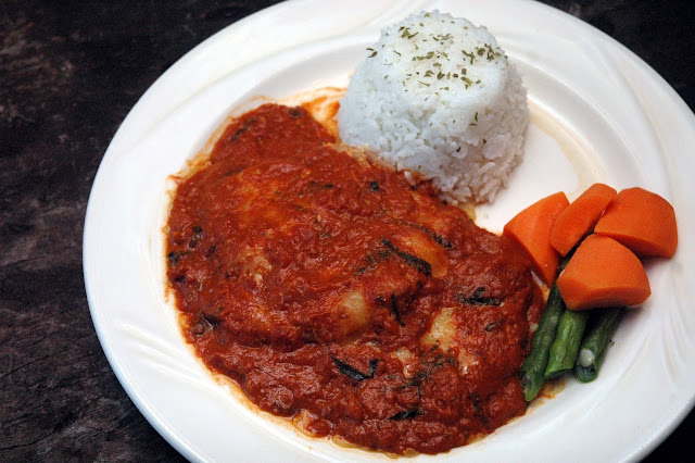 ...the rich and savory Chicken Marsala (P 390) with tender chicken fillet topped with ham and mozzarella cheese covered in creamy marsala wine and caper sauce...