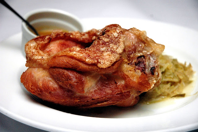 Tender and juicy pork capped with a lightly crisp layer of crackling, perfect with a dab of spicy mustard and sour sauerkraut.