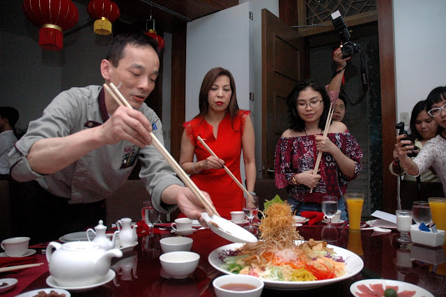 Then, extra long wooden chop sticks were handed out for the much awaited moment. At Executive Chinese Chef Peter Leung's cue, shouts of "Lo Hei" signaled the start of the ceremonial toss. The salad must be tossed high up toward the center for seven times while shouting out your wishes for the new year.
