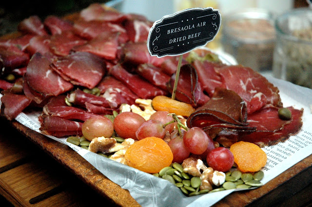 ...along with deep and dark red, almost purple, Bresaola Air-Dried Beef with its distinct musty notes. The cheese and charcuterie selection alone takes you to all corners of the European continent. And that's just for starters.