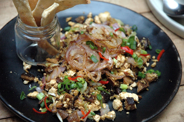 ...followed by the flavorful Tofu Salad (P 280), a vegan dish with grilled tofu, toasted chickpeas, apples and seasonal greens drizzled with a tart calamansi dressing. And right off the bat, Nonie's proves in just two dishes that healthy food doesn't have to be bland or even boring. The flavors are clean and fresh, punctuated by sweet notes and the soothing heat of chili in a vibrant palette of colorful flavors.