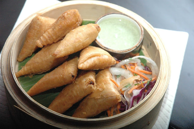 ...starting with the Crispy Chicken Samosa Spring Rolls with coriander yogurt and fresh mint. Perfectly deep-fried with a light crispness, the mildly spicy samosas with thin flaky pastry offers both flavor and texture followed by rounded notes from Chef Radhey Shayam's spice blend for depth.