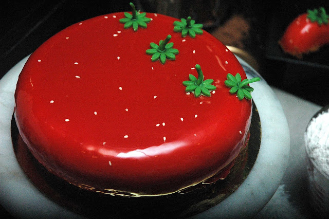 A few more sprinkles of sesame seeds to replicate the surface of a bright red strawberry, Miko's New York Cheesecake Entrement is done.