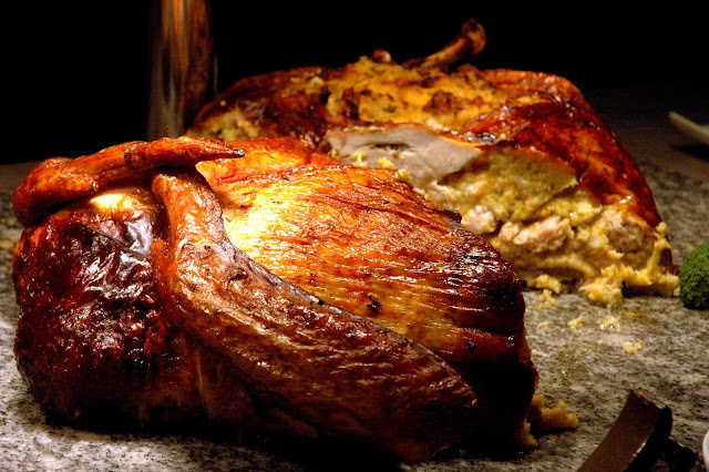 Then, there's the Turducken Turkey, almost bursting at the seams with the stuffed duck and chicken, ready to be carved...
