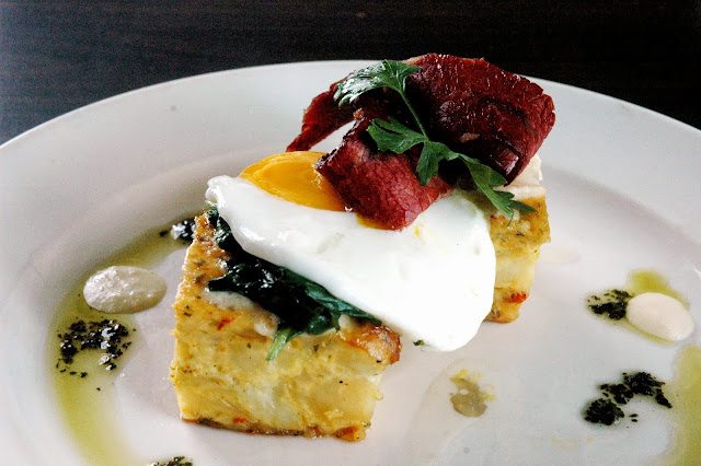 Then, there's corned beef and potatoes, another classic reinvented by Chef Josh Boutwood with the new Homemade Corned Beef Brisket with Potato Omelet (P 295), house specialty corned beef topped with fried egg and spinach on Mediterranean potato omelet. The rich and creamy potato omelet, almost like a gratin or a fritata, provides the perfect base for the lightly briny homemade corned beef. The sunny side up and spinach rounds out the flavors for another cool breakfast dish.