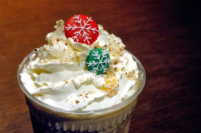 And finally, SBC's Gingerbest, a rich blend of white chocolate mocha mixed with gingerbread syrup, garnished with whipped cream, red and green Christmas tree sprinkles and topped with a gingerbread candy man.