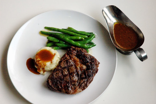 Burger Company's Ribeye Steak (P 350), 8 oz. USDA Choice Ribeye Steak with demiglace, served with roasted garlic mashed potatoes and buttered vegetables. Thick, tender, char-grilled to medium rare for a juicy pink center. Burger Company's ribeye comes with a flavorful demiglace, a rich brown sauce, but it's great even without the sauce, just the way I like it. And for the price, this one's definitely another winner from Burger Company, and another personal favorite.