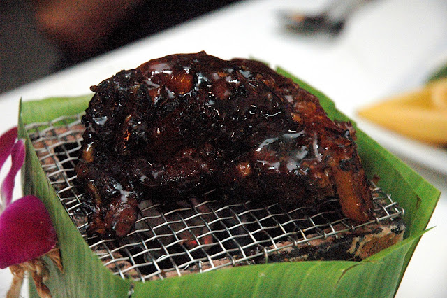 Siamese Pork Ribs, tender ribs with cinnamon caramel glaze, atop a banana leaf wrapped brick containing hot charcoal. As the dish is placed on the table, the smoky aroma of grilled pork with notes of cinnamon makes this dish impossible to resist. The pork is soft and tender, a personal favorite.