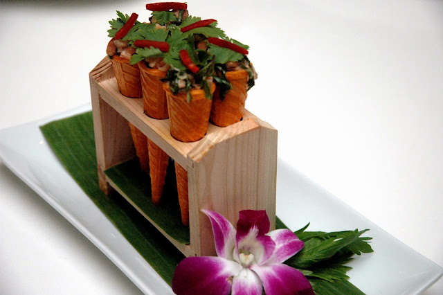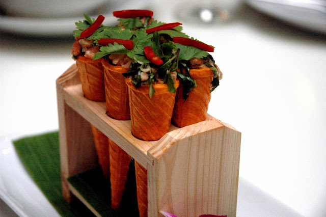 Salmon Cones, salmon cubes infused with lemongrass, lime, and herbs, another beautifully presented dish combining the subtle flavors of salmon with the sharp notes of herbs.