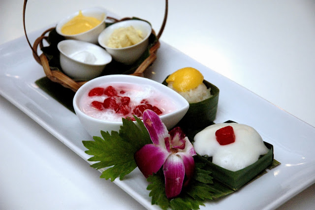 Silk Road Dessert Sampler, featuring an elegantly plated sampler of Silk Road's signature desserts including Mango, Young Coconut, and Durian Ice Cream, Sweet Mangoes on Sticky Rice, Takhoo Thai, and Coconut Milk with Tapioca.