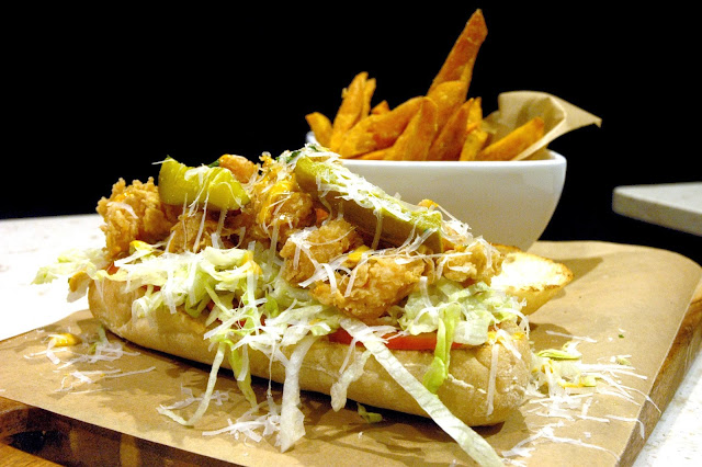 Shrimp Po'Boy (P 419), Cajun-breaded shrimps with remoulade on a soft ciabatta roll with a side of crisp sweet potato fries. A hearty sandwich loaded with crunchy plump shrimps deep-fried to perfection, fresh vegetables, a creamy tartar dressing and a dill pickle. This one's seriously good.