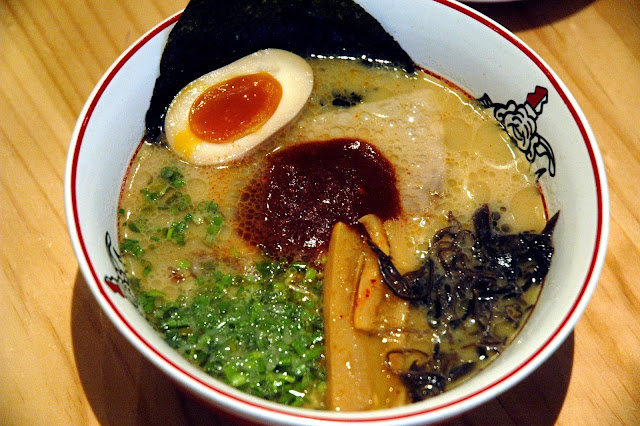 Next up, Ikkoryu's new red ramen, the Aka Tonkotsu (P 380), topped with a dollop of red miso paste, Slowly stir your bowl, and your ramen gradually transforms into a bright red broth. Another distinctly flavored ramen, packed with intense flavors. In contrast with the green ramen, the spice is more subdued, yet with equally bold flavors.